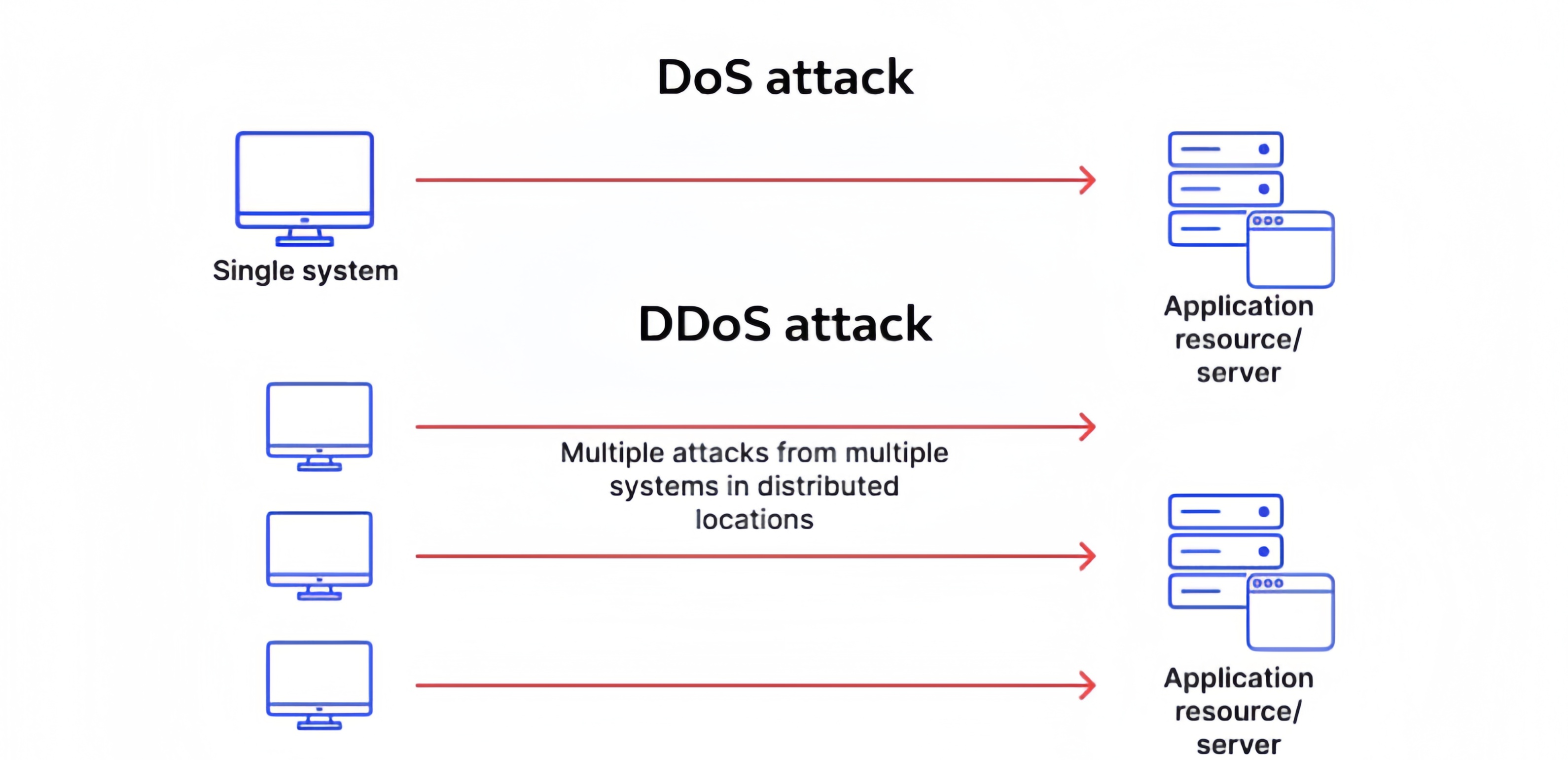 * DDoS: Serangan dilakukan menggunakan banyak perangkat (biasanya merupakan jaringan botnet). Perangkat-perangkat ini secara bersamaan mengirimkan permintaan ke target, sehingga dampaknya jauh lebih besar dan sulit untuk diatasi.